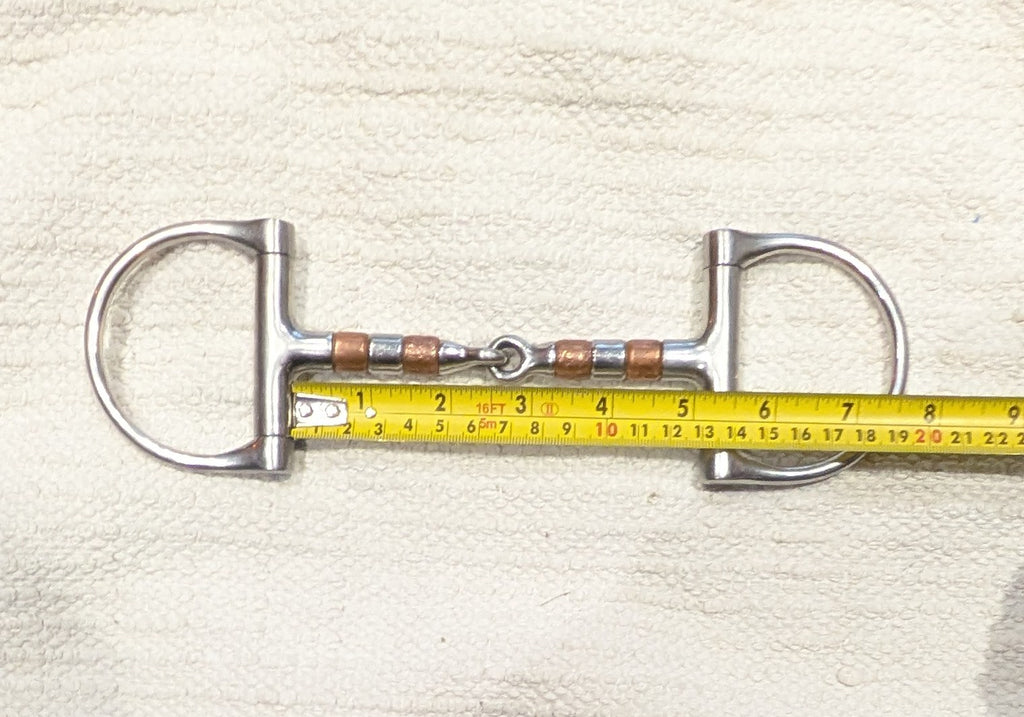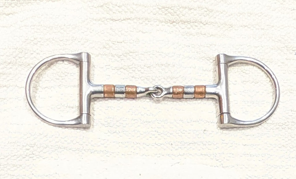 D ring snaffle with a single jointed mouthpiece with copper rollers.
