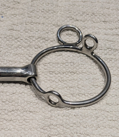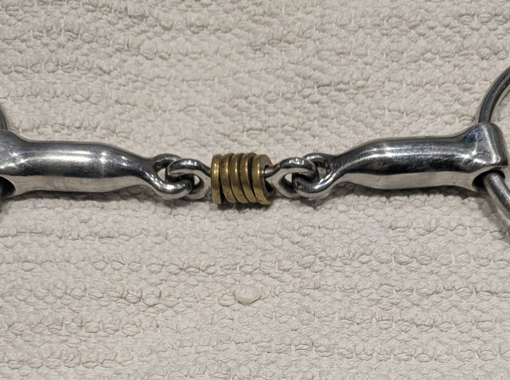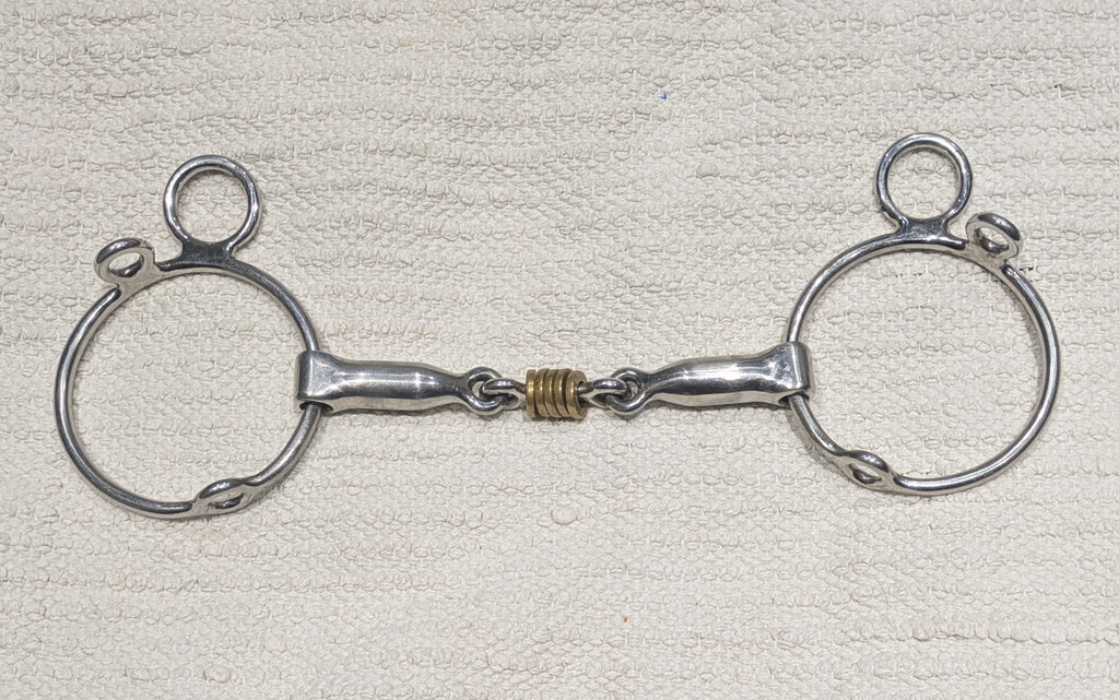 Curb gag bit with specific small rings to take an additional curb gag rein. The mouthpiece is similar to the Bombers Colin Miles bit (but not sweet iron). Double jointed with central copper discs to create tongue pressure and also give the horse something to play with.