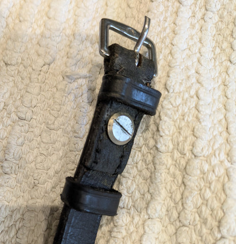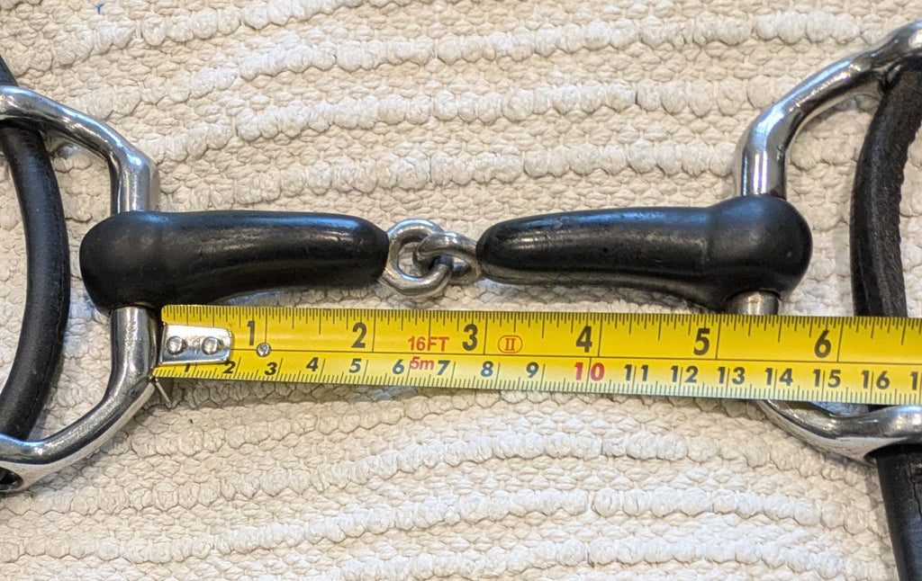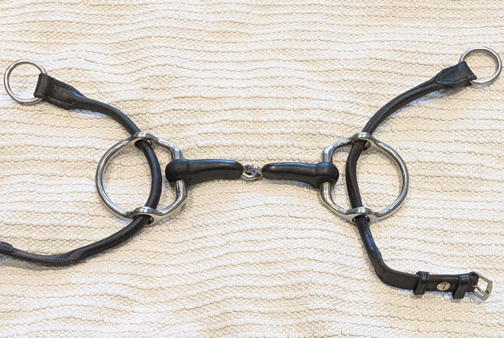 Quality English made cheltenham running gag, by Abbey England. Has a hard rubber mouthpiece and comes with black leather cheeks.