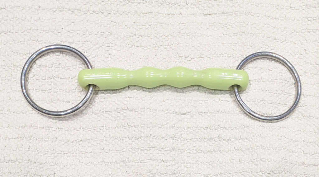 Shires EquiKind Ripple Loose Ring Snaffle Bit is lighter and more flexible than a traditional rubber bit. Also the apple flavour gives a pleasant experience in the horses mouth.