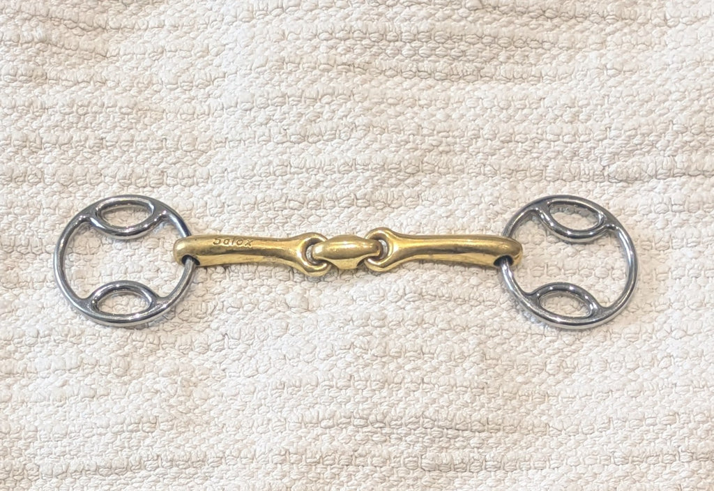 The neue schule bevel (wilkie) snaffle bit from the Performance Pony Range. It has smaller proportions for a pony head - smaller ring, slimmer mouthpiece and thinner ring.