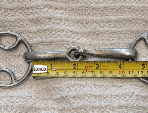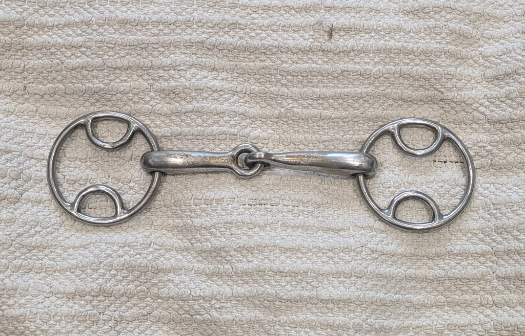 Stainless steel bevel snaffle with single jointed mouthpiece.