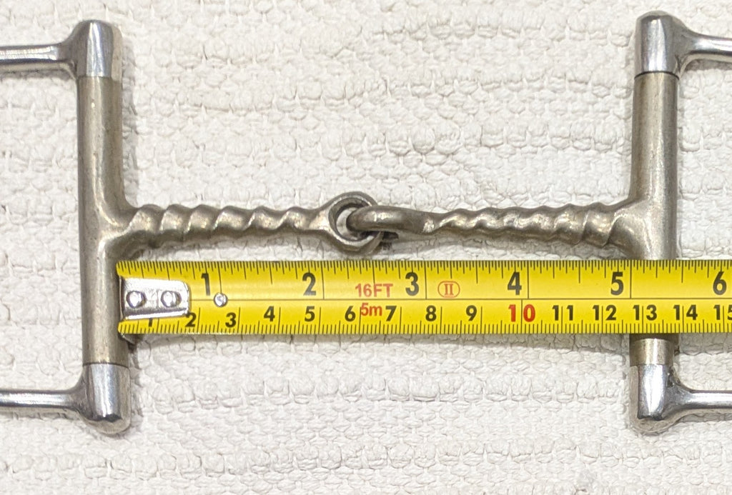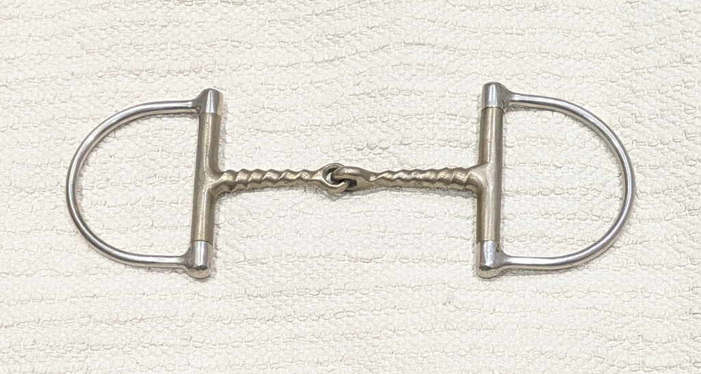 A custom made D ring snaffle with a fast twist single jointed mouthpiece. The rings are stainless and mouthpiece german silver. This bit is quite well used but still completely functional.
