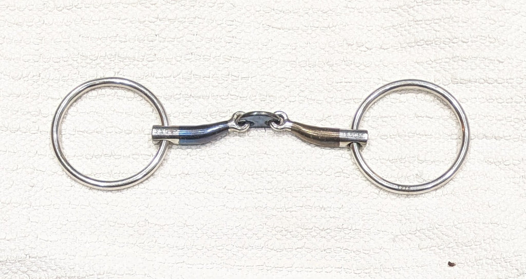 Lightweight fixed ring snaffle with low port and double jointed mouthpiece. The central link is a small flat plate.
